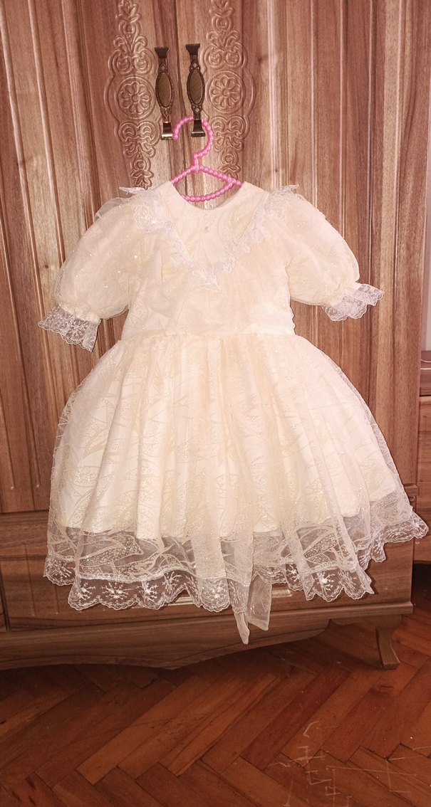 kirli beyaz sarımtırak bir renk kız çocuk kabarık elbise 1 kere doğum günü için giyildi