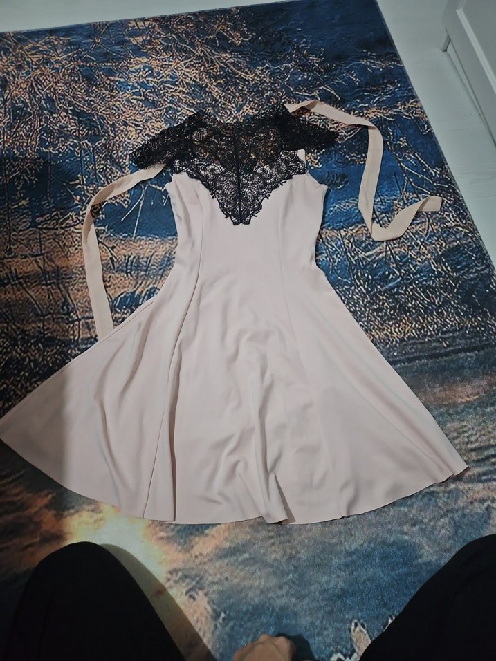 Beyaz mini elbise, straplez ve ince siyah dantel detaylı, vücuda oturan kesimiyle şık bir düğün tercihi.