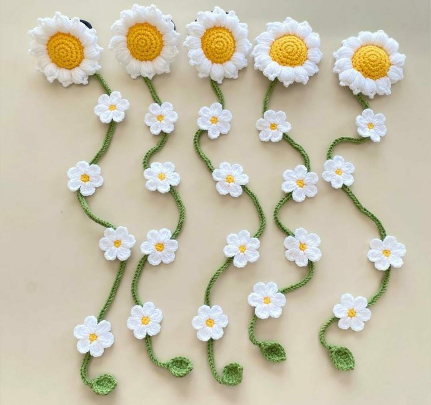 Beyaz dantel papatyalar ve yeşil saplardan oluşan, bohem tarz için uygun saç aksesuarı .
