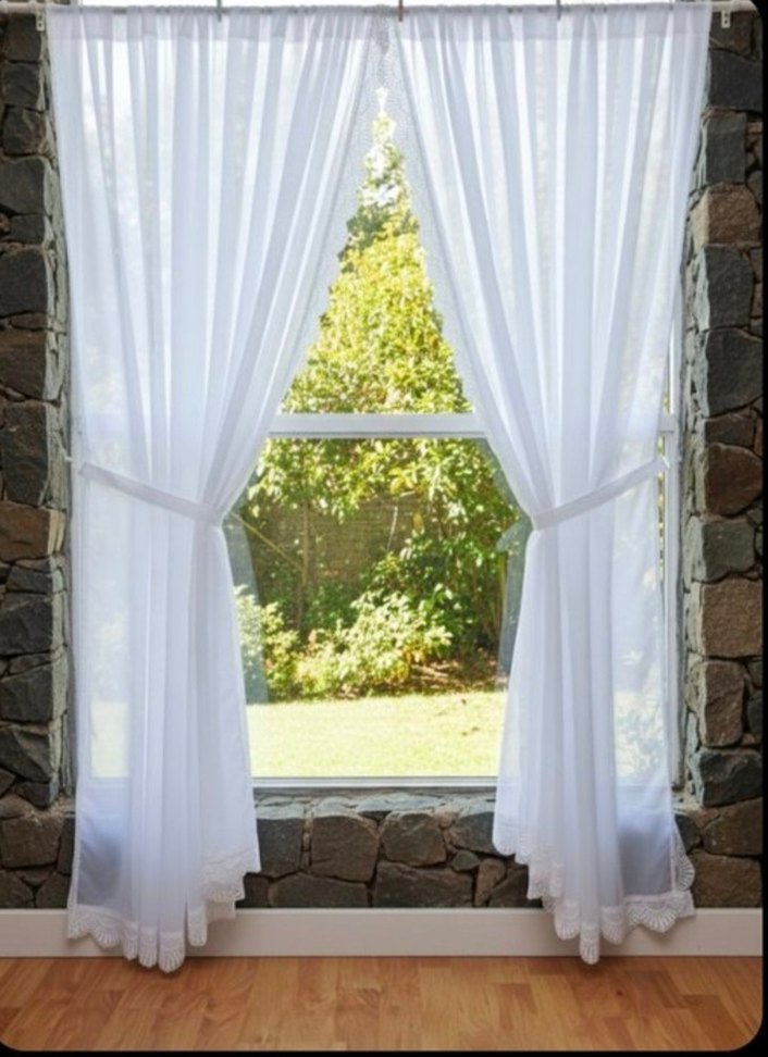 Alt ve yan kısmı dantelli, beyaz tül perdeler. Yumuşak ve şeffaf kumaştan yapılmış, klasik tarzda, ışık alır Tertemiz sorunsuz Hazır dikili halkaları üzerinde mevcut Sayfamda 2 adet mevcut En 126 cm Boy 250 cm HER BİR KANAT ÖLÇÜSÜDÜR. Yandaki bağlama aparatları mevcuttur. ÇİFT KANAT SATILMAKTADIR.