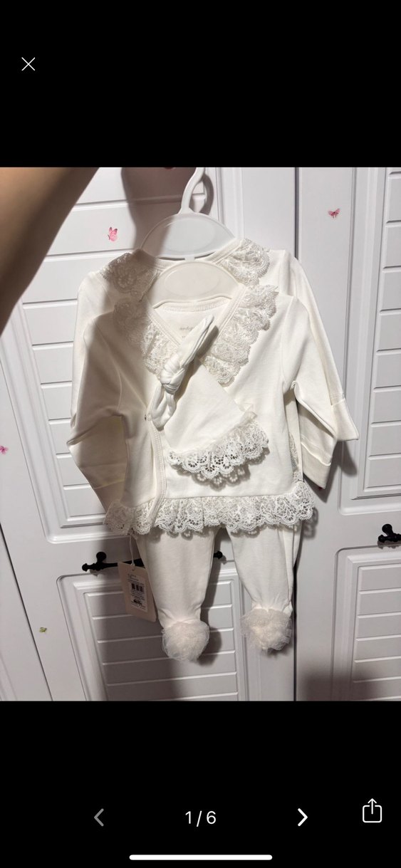 Beyaz renkli, dantelli ve nakışlı desenli uzun kollu bebek kıyafet seti. Yumuşak kumaştan üretilmiş ve dantelli şapka içermektedir.