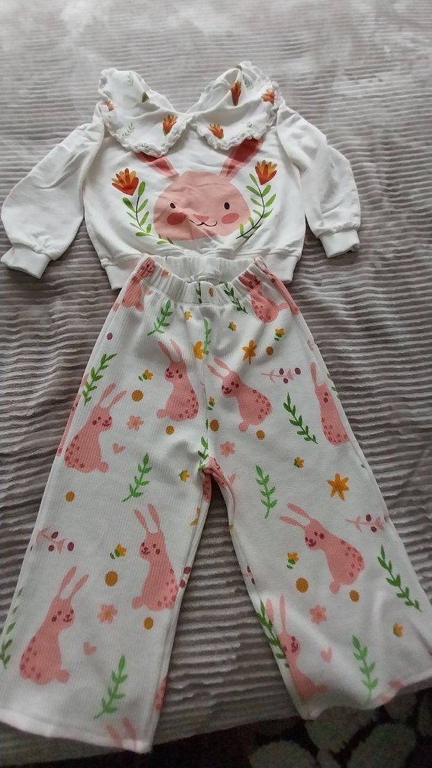 Beyaz uzun kollu üstü dantel detaylı, tavşan baskılı ve elastik bel pastel desenli pantolonlu bebek kıyafet seti çok cici bir takım 3 defa falan giyildi bedeni 3-4 yaştır ama 3 yaşa daha uygundur isteyene ölçü verebilirim...