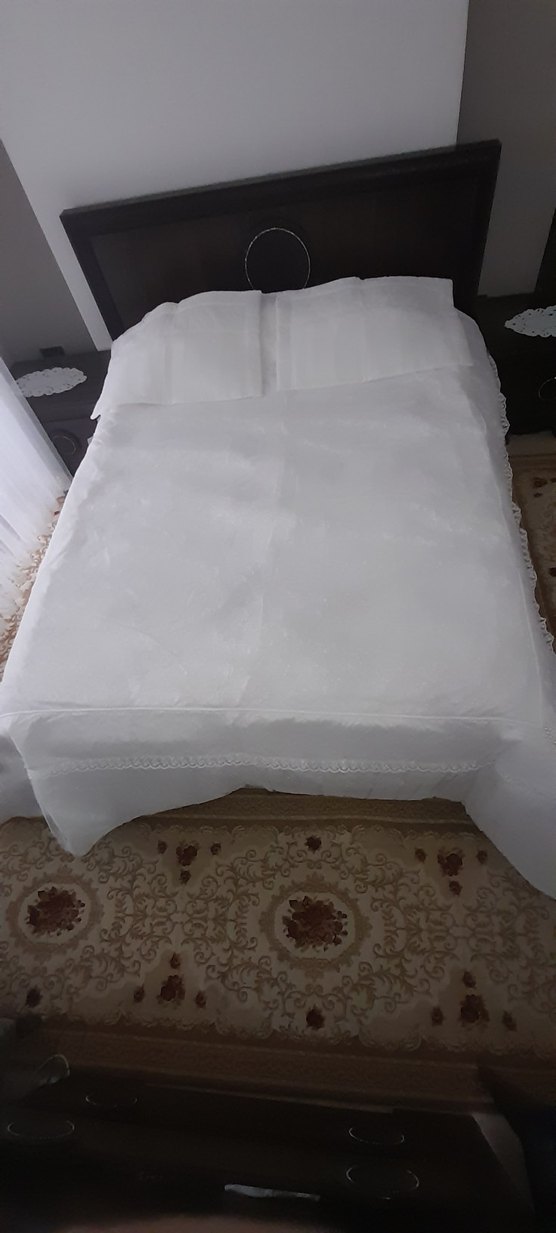 Düz ve dantelli beyaz yatak örtüsü, sade ve temiz bir görünüm sağlar. ️karacadan alınmıştı hiç kullanılmadı, odada tepe lambası olmadığı için dantelli kısım net belli olmuyor, o sebeple ayrıca fotografladim, çok zarif bir takım,güle güle kullanılsın #karaca #bride #ceyiz