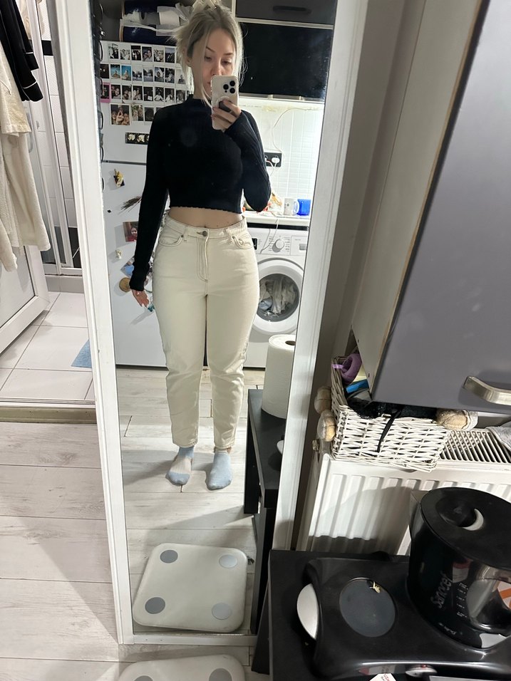 Beyaz renkte, dar kesim uzunluğunda kot pantolon. Günlük kullanıma uygun, rahat ve şık sokak stili için ideal.