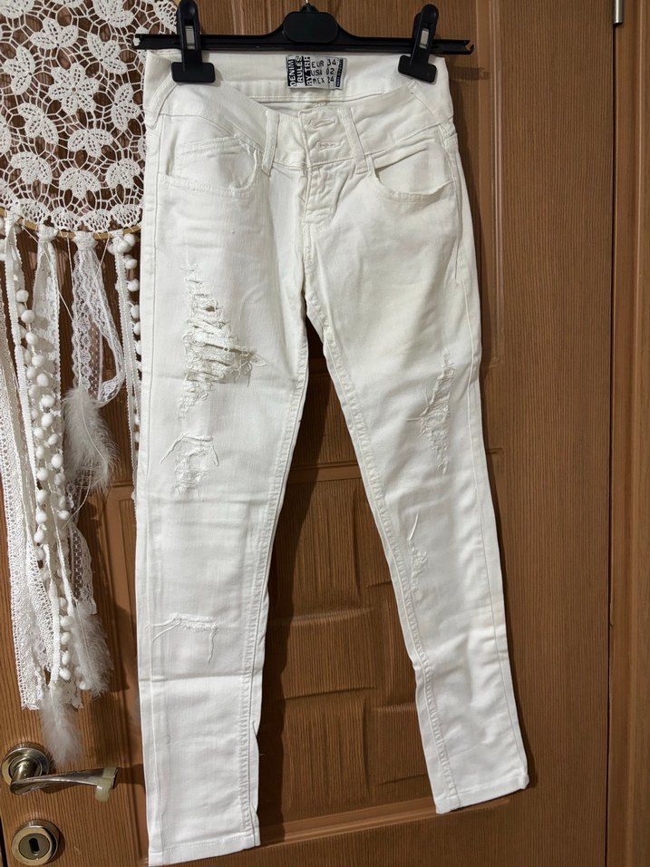 Düğmeli, yırtık detaylı beyaz dar kesim kot pantolon. Hafif renk ve günlük sokak stili için uygun.