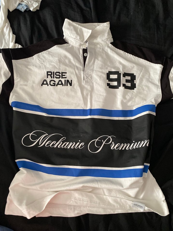 Sentetik kumaştan yapılmış, yüksek yakalı ve kısa kollu, dar kesim beyaz erkek polo tişört. "RISE AGAIN," "93" ve "Mechanic Premium" baskılı, kemerli tasarıma sahip spor tarzda.