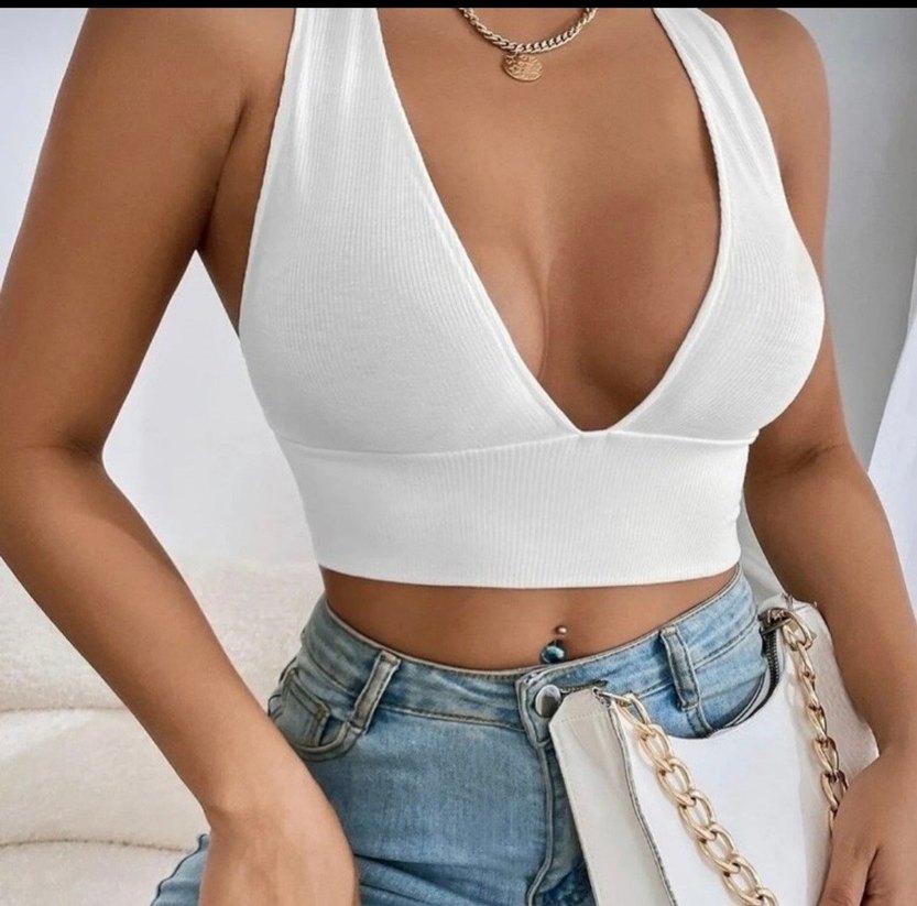 Derin V yaka ve ince askılı, beyaz mini crop top. Denim kumaştan, günlük kullanıma uygun rahat ve şık bir parça.