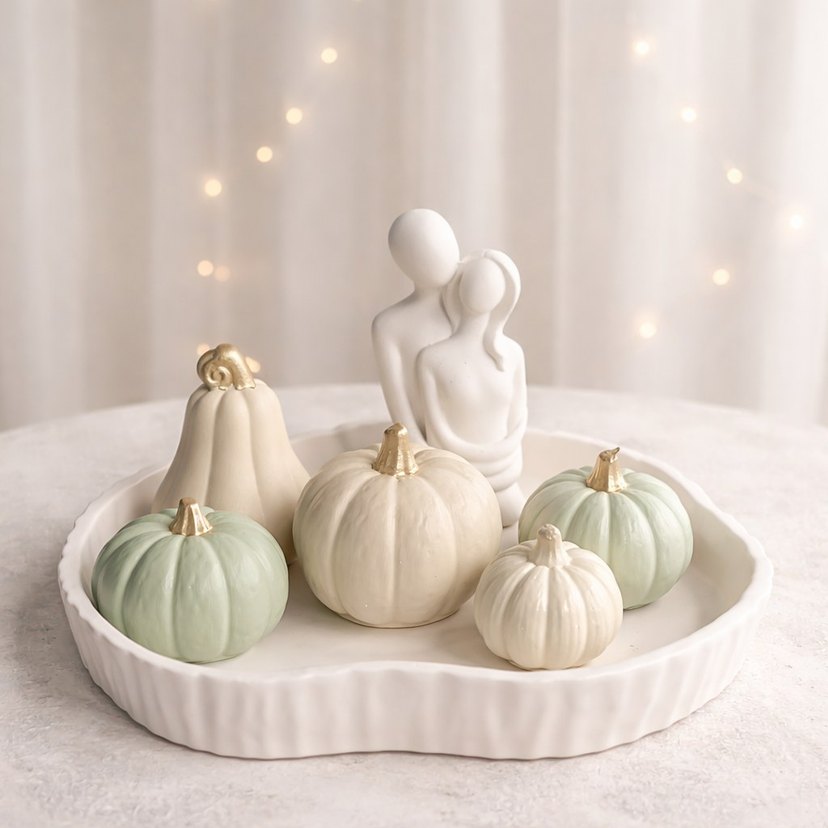 Altın saplı beyaz ve açık yeşil balkabakları ile beyaz soyut çift figürünün yer aldığı beyaz dokulu tepsi üzerinde dekoratif set.
