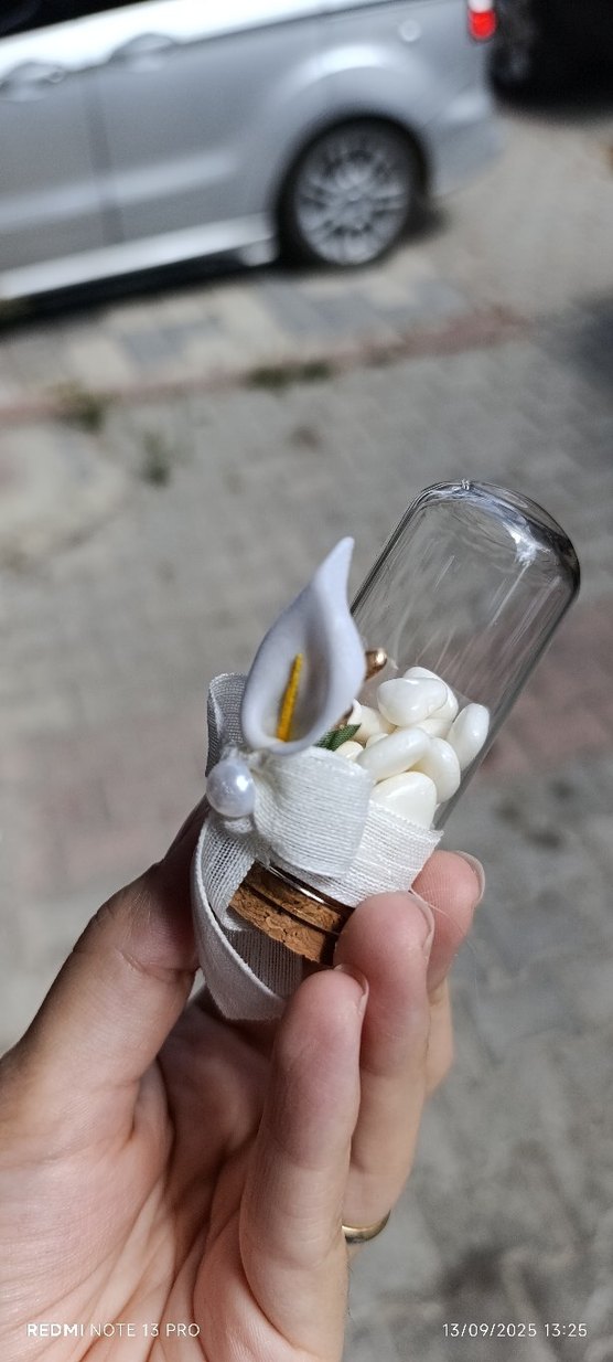 Beyaz şekerler içeren cam şişe, beyaz çiçek ve kurdele ile süslenmiştir, şık bir hediye seçeneğidir.