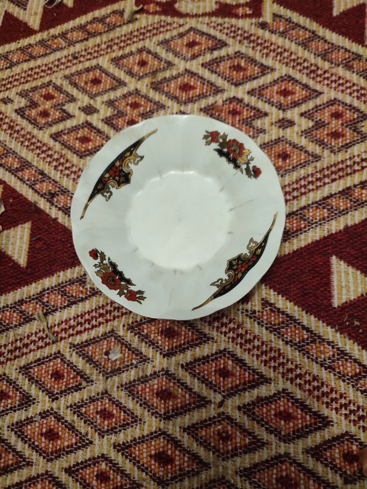 Çiçek ve süslemeli desenlere sahip beyaz dekoratif tabak, hafif kullanım izleri bulunur. 1 adet