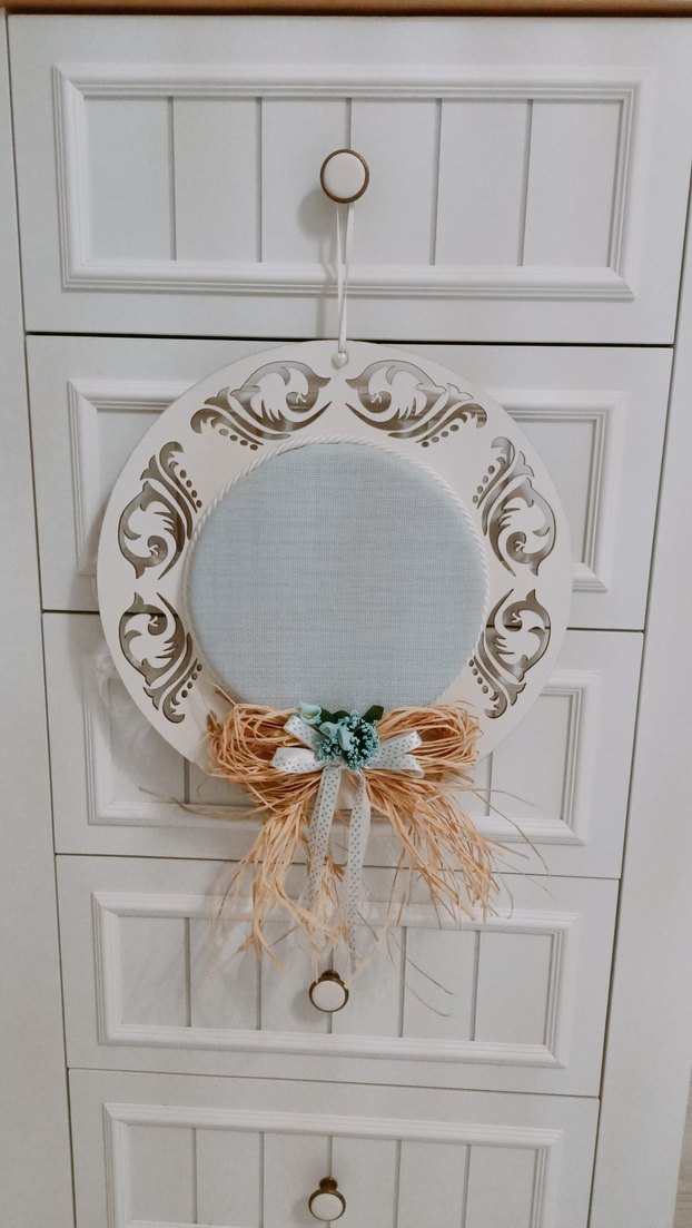Orta kısmı kumaş kaplı, süslü beyaz yuvarlak çerçeveli, doğal hasır fiyonk ve küçük mavi çiçeklerle dekoratif duvar süsü.