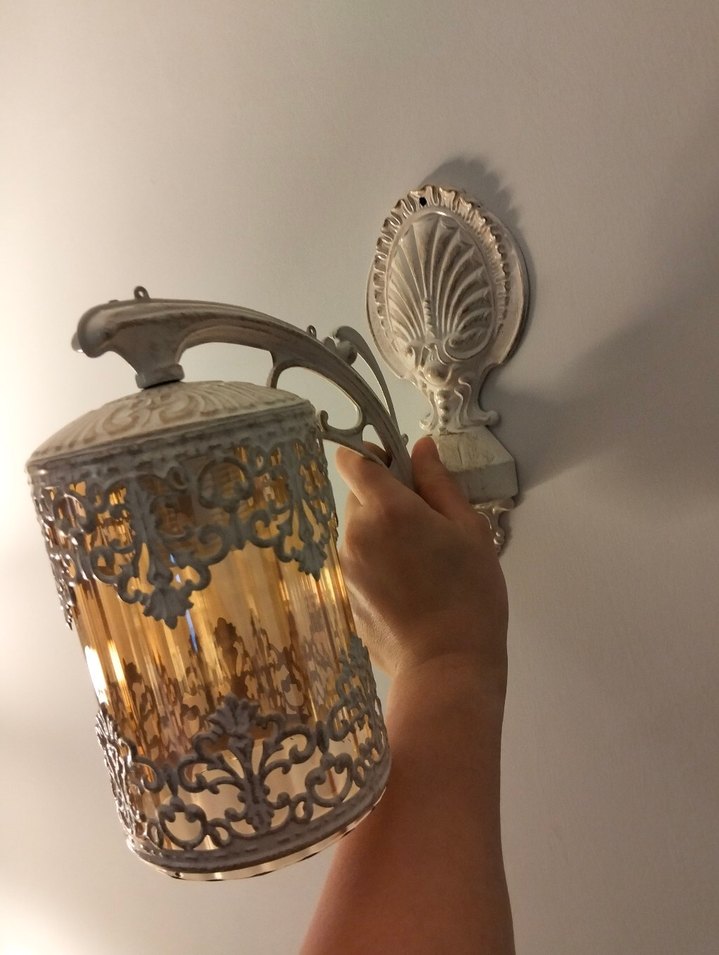 Beyaz dekoratif duvar lambası, detaylı metal işçiliği ve vintage tasarıma sahiptir. Kavisli kol ve ayrıntılı arka plaka ile duvara monte edilir.