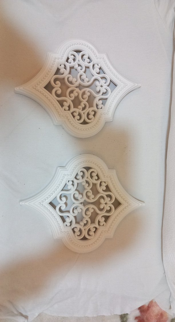 İki adet beyaz dekoratif duvar süsü, detaylı kıvrımlı desenlere sahip, ev dekoruna klasik bir dokunuş katar.