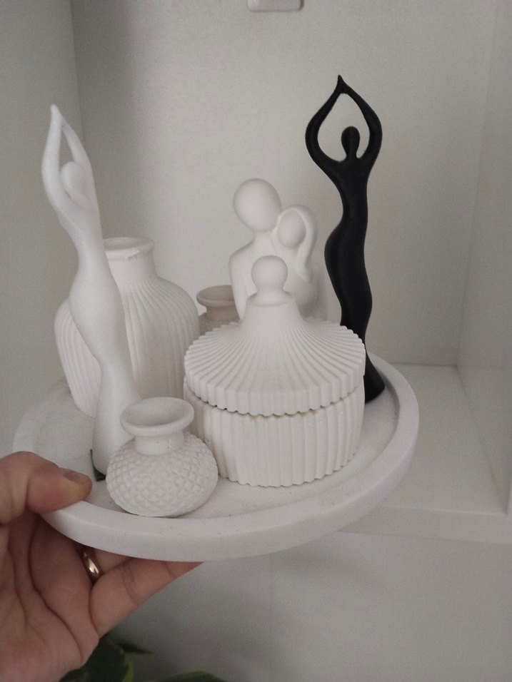Beyaz dekoratif figürler ve kapaklı mum,pürüzsüz ve dokulu yüzeylere sahip, sergilemek için uygun. ️
