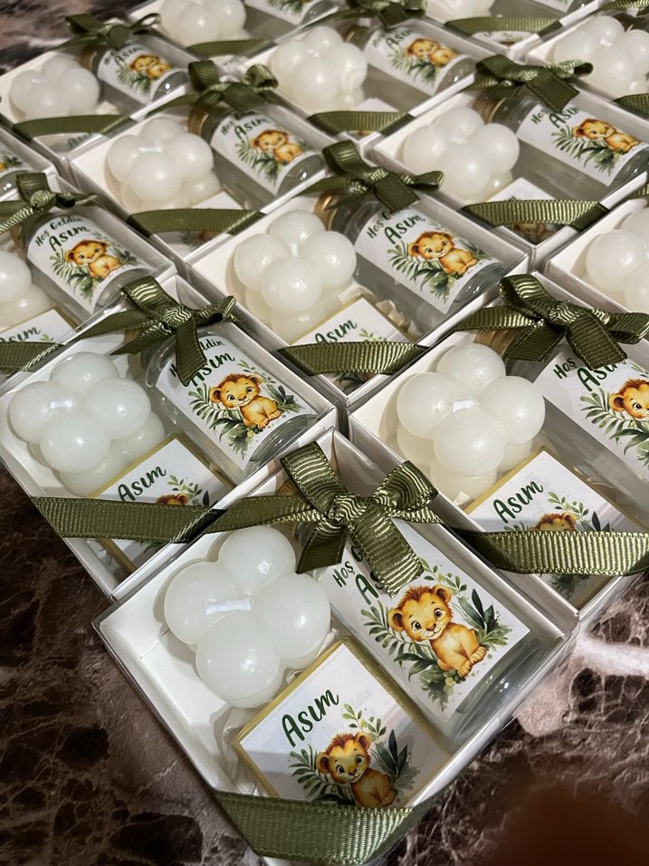 Bu beyaz dekoratif hediye seti, Asum etiketi ve sevimli bir aslan resmi bulunan küçük kart ile bağlanmış zeytin yeşili kurdeleye sahip özel şekilli mum içerir.