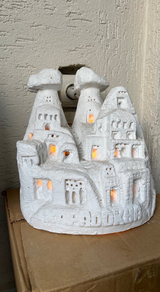Bu beyaz dekoratif figürin, ışıklı pencereleriyle Kapadokya tarzı bir köyü temsil eder. Detaylı mağara evleri ve bacalar bulunur. Ürün alçıdan ve ağırdır. Pazarlık vardır.