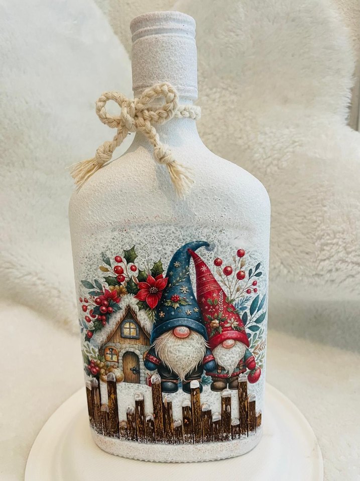 Beyaz renkte, dokulu yüzeye sahip dekoratif vazo, üzerinde kış temalı cüceler ve kulübe resmi bulunur, rustik ip detayı vardır. ❄️