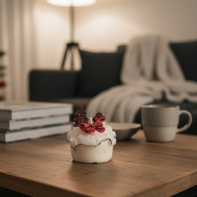 Üzerinde küçük kırmızı süslemeler bulunan dokulu beyaz dekoratif mum. ️