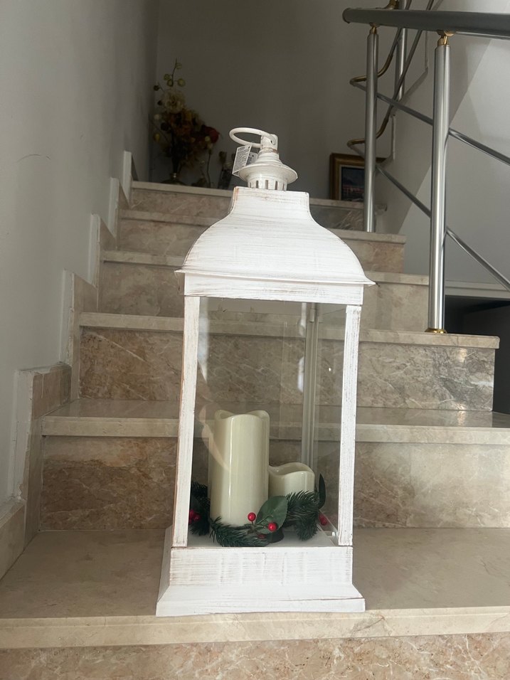 Cam panelli beyaz dekoratif mumluk, içinde üç adet silindir mum ve küçük bir yılbaşı süsü bulunur. Üstte taşıma kulpu vardır. ️