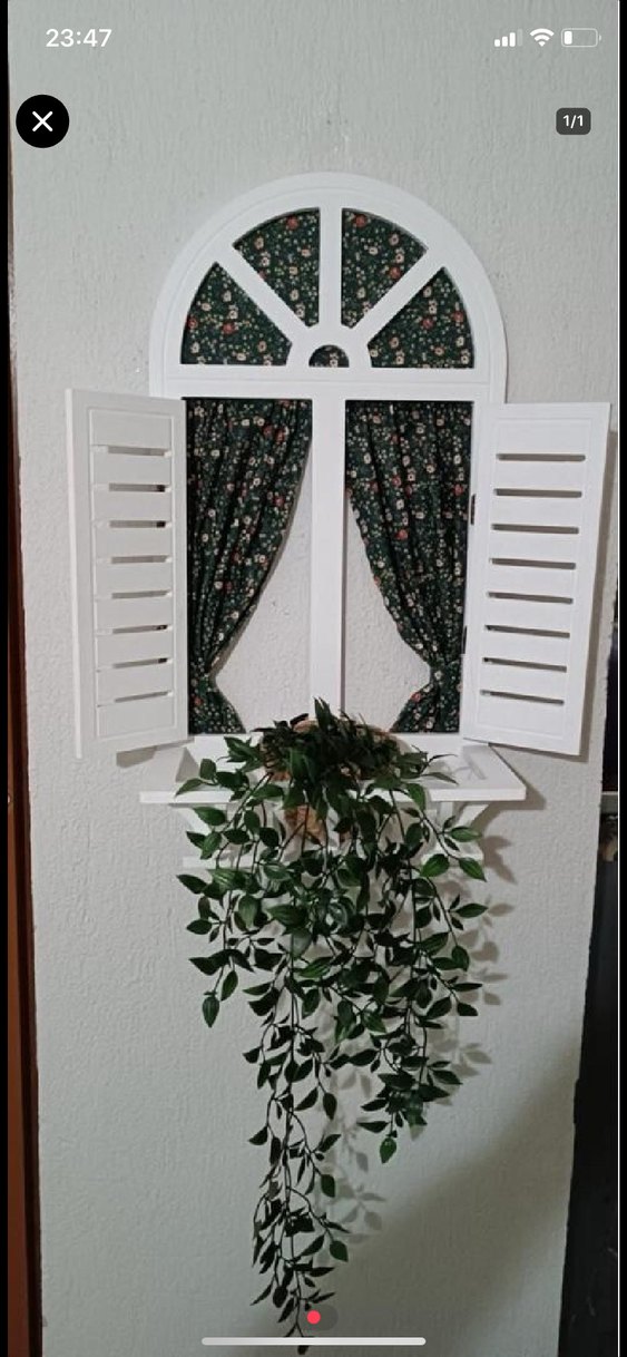 Açık panjurlu, çiçek desenli perdeli beyaz dekoratif pencere çerçevesi. yeşil bitki dahil değil perdeler dahil. İKİ ADEDİNİN FİYATIDIR.