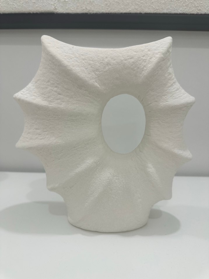 Beyaz seramikten yapılan, dokulu yüzeyi ve ortasında boşluk bulunan dekoratif vazo. Hafif rengiyle ortama zarif bir dokunuş katar.