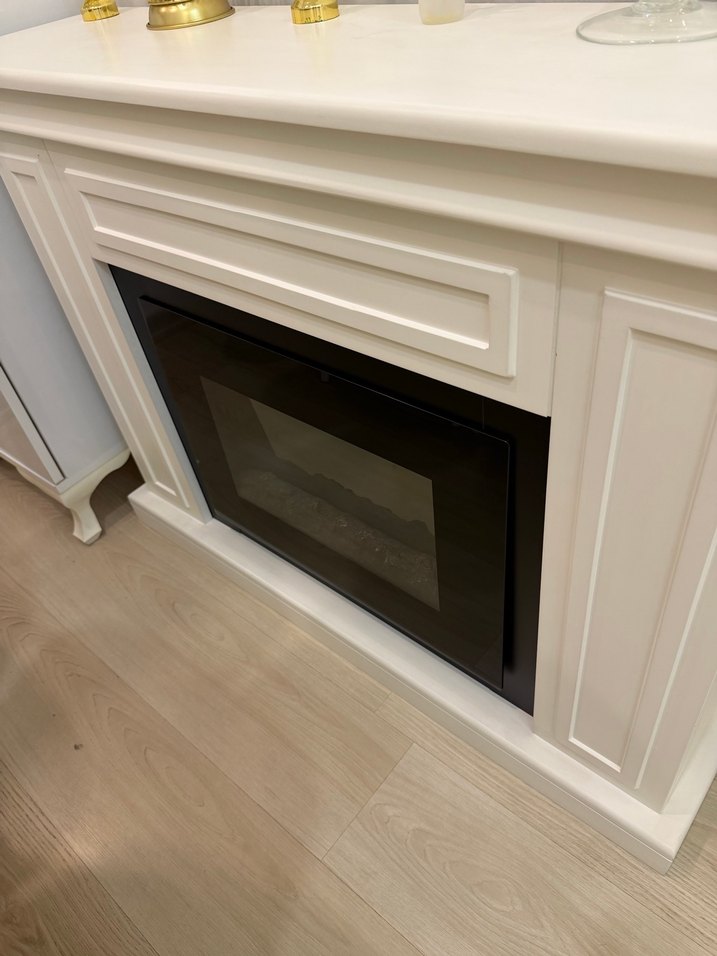 Klasik tasarımlı beyaz dekoratif şömine ünitesi, siyah cam panel ve detaylı çıtalara sahiptir. Pürüzsüz yüzeylidir. ️
