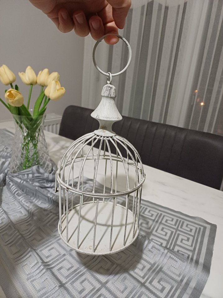 Yuvarlak tabanlı ve asma halkalı beyaz dekoratif tel kafes mumluk, ortama şık bir dokunuş katar. ️