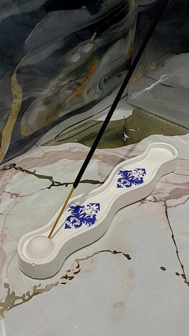 Mavi çiçek desenli beyaz dekoratif tütsülük, tek tütsü çubuğunu sabit tutmak için tasarlanmıştır. Sakinleştirici ortam yaratmak için uygun. ️