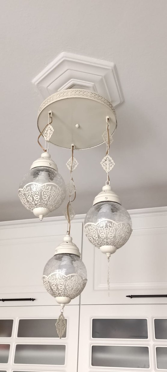 Beyaz renkte, üç adet desenli cam küreli dekoratif tavan lambasıdır. Yumuşak ve hoş bir aydınlatma sağlar.