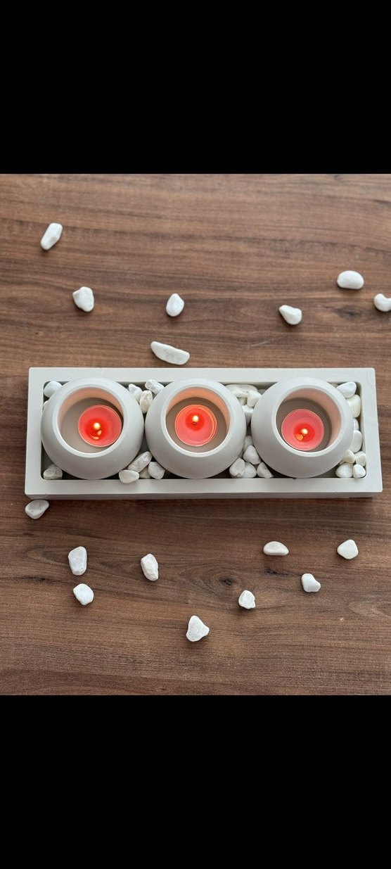 Üç beyaz mumluk, dikdörtgen taban üzerinde beyaz dekoratif taşlarla birlikte, yumuşak ve şık bir atmosfer sağlar. ️