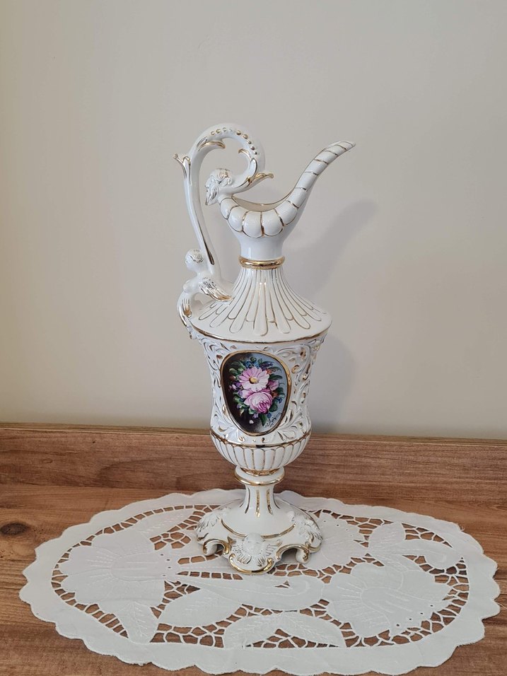 Altın detaylı, beyaz dekoratif vazo, zarif kulplar ve çiçek motifli desenlerle süslenmiştir. 43 cm boyunda Capodimonte İtalyan el yapımı vazo. Üzerinde hafif silinmeler mevcut olup, fiyata yansıtılmıştır. Atık, kırık, çatlak yok. İhtiyaç fazlası olduğu için satıyorum. Tüm detaylar fotoğraflarda mevcuttur. Lütfen dikkatli inceleyin iade kabul etmiyorum. #Capodimonte #vazo #İtalyan #italy #elyapımı #vintage #dekoratifobje #dekoratifaksesuar