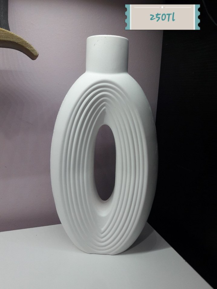 Bu beyaz dekoratif vazo, oval şekli ve dokulu halkalarıyla modern dekorasyon için uygundur. Fiyatı 250TL.