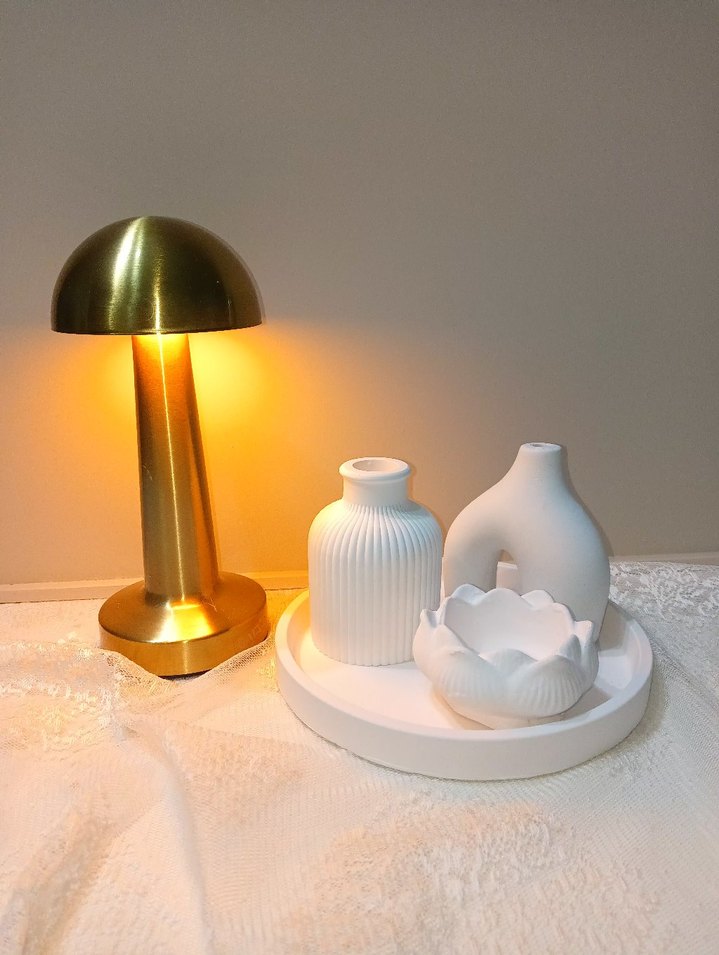 Farklı şekillerde beyaz dekoratif vazolar yuvarlak tepsi üzerinde 4 lü set