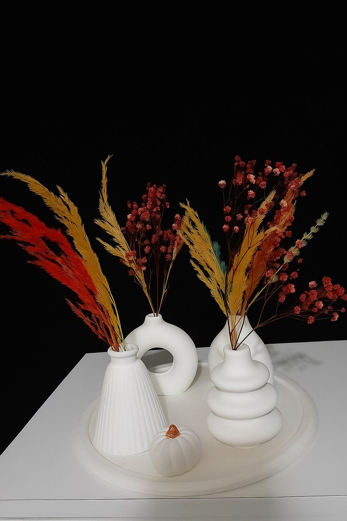 Farklı şekillerde beyaz dekoratif vazolar ve kuru çiçeklerle modern bir dokunuş sağlar.