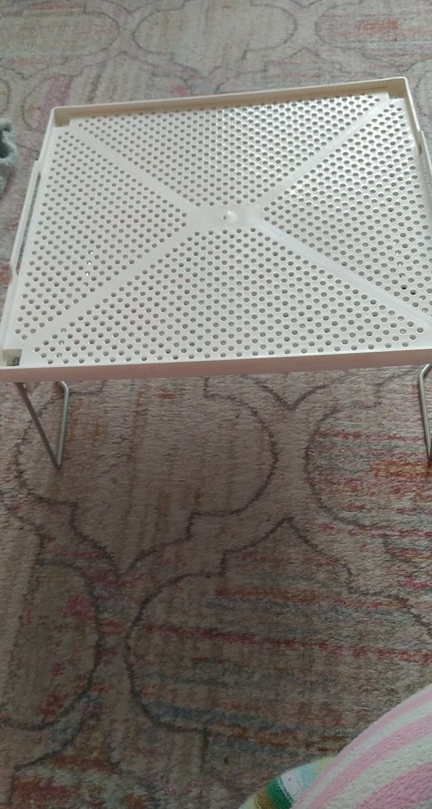 Beyaz delikli yüzeye sahip, katlanabilir gri metal ayaklı ayarlanabilir dolap düzenleyici. ️
