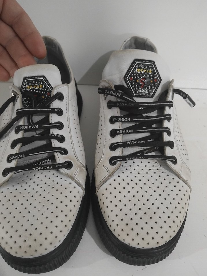 Delikli beyaz kadın spor ayakkabısı, siyah bağcıklarında 'Fashion' yazısı bulunur. Kauçuk tabanlı ve dil kısmında baskılı amblem yer alır.