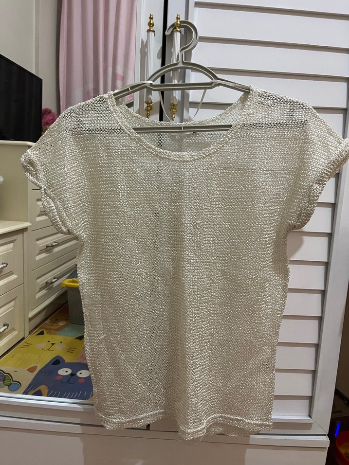 Bu beyaz örgü bluz, kısa kollu ve yuvarlak yakalıdır. Sentetik kumaştan, bol kesim ve normal midi uzunluğundadır. Rahat sokak stili için uygundur.