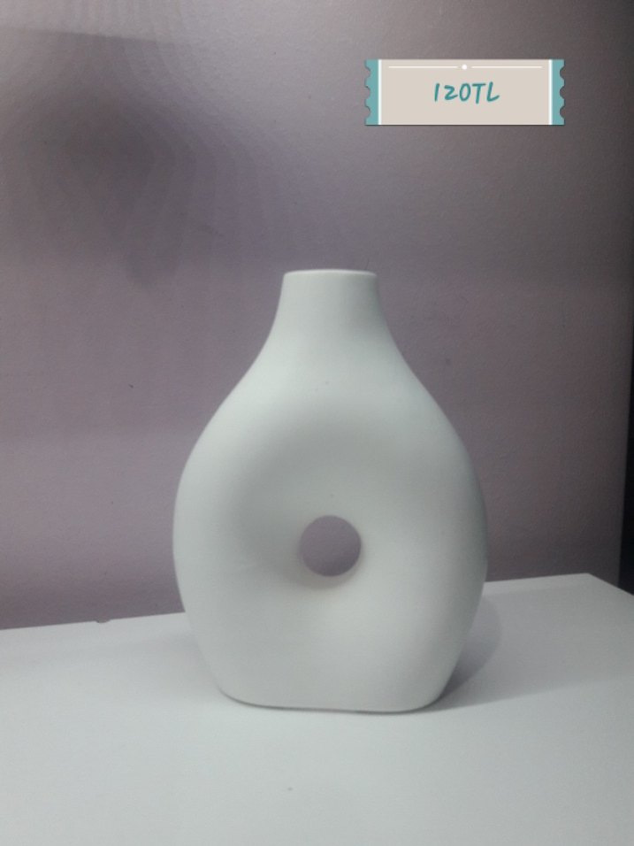 Beyaz Taş tozundan yapılmış, ortasında delik bulunan modern tasarımlı vazo. Düz yüzeyi ve sade rengiyle dekorasyona uyum sağlar.