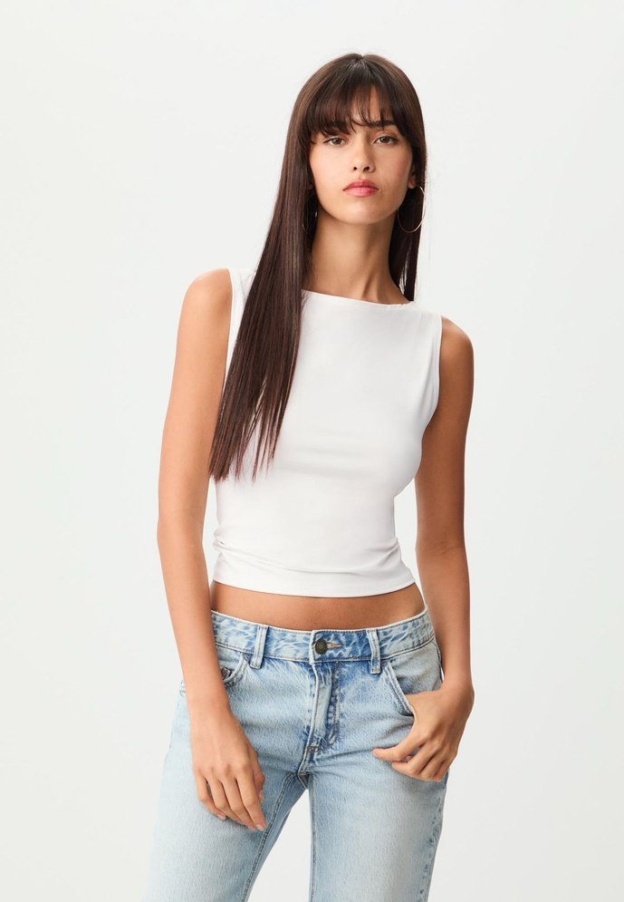 Beyaz denim kumaştan, düz yakalı ve kolsuz crop top. Normal midi boyda, dar kesim ve desen içermeyen tasarımıyla günlük sokak stiline uygun, zahmetsiz şıklık sunar.