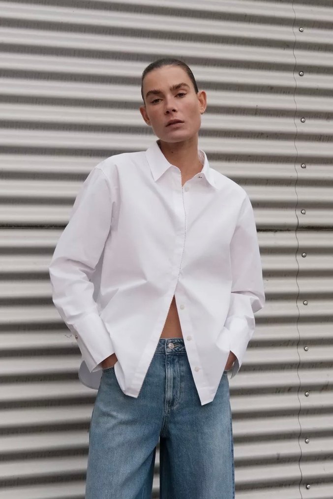 Beyaz denim kumaştan, normal uzunlukta, uzun kollu ve yakalı kadın gömlek. Günlük kullanıma uygun, rahat ve şık bir tasarım.