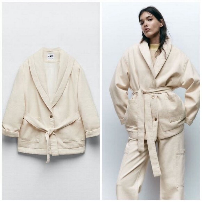 Beyaz keten/denim kumaştan, rahat kesimli, notalı yaka ve uzun kollu kadın ceket. Midi boy ve desensiz tasarımıyla günlük kullanıma uygun, şık ve rahat bir parça.
