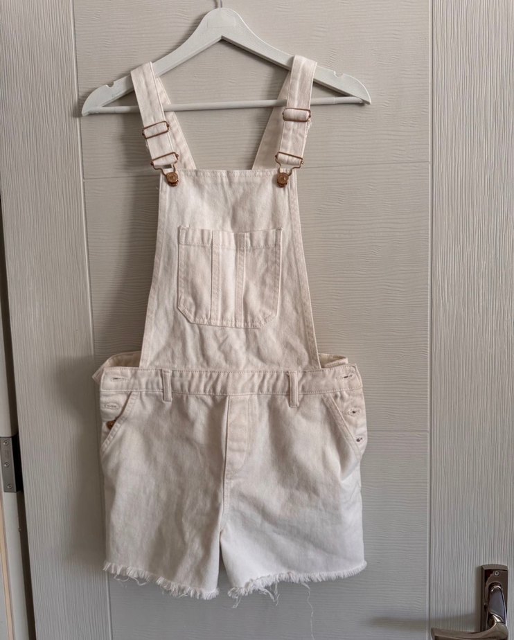 Hiç kullanılmadı Ayarlanabilir askılı, ön cepli beyaz denim mini tulum. Rahat kesimi ve bohem tarzıyla günlük kullanıma uygundur.
