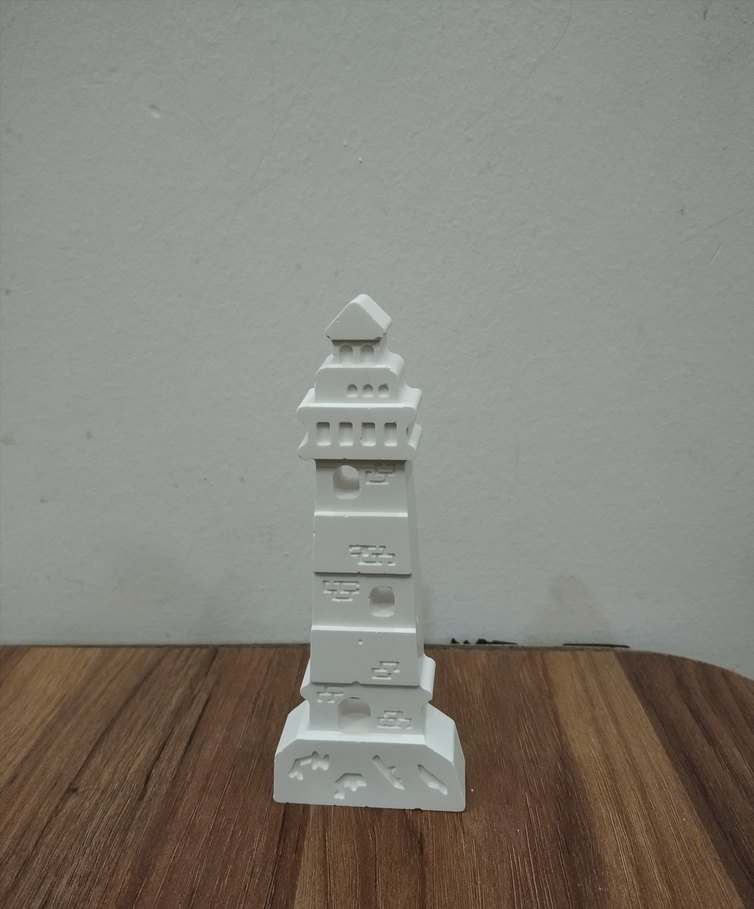 Basit mimari detaylara sahip beyaz deniz feneri şeklinde figür. İnce ve yüksek yapılı, küçük pencereleri ve sivri tepesi vardır.