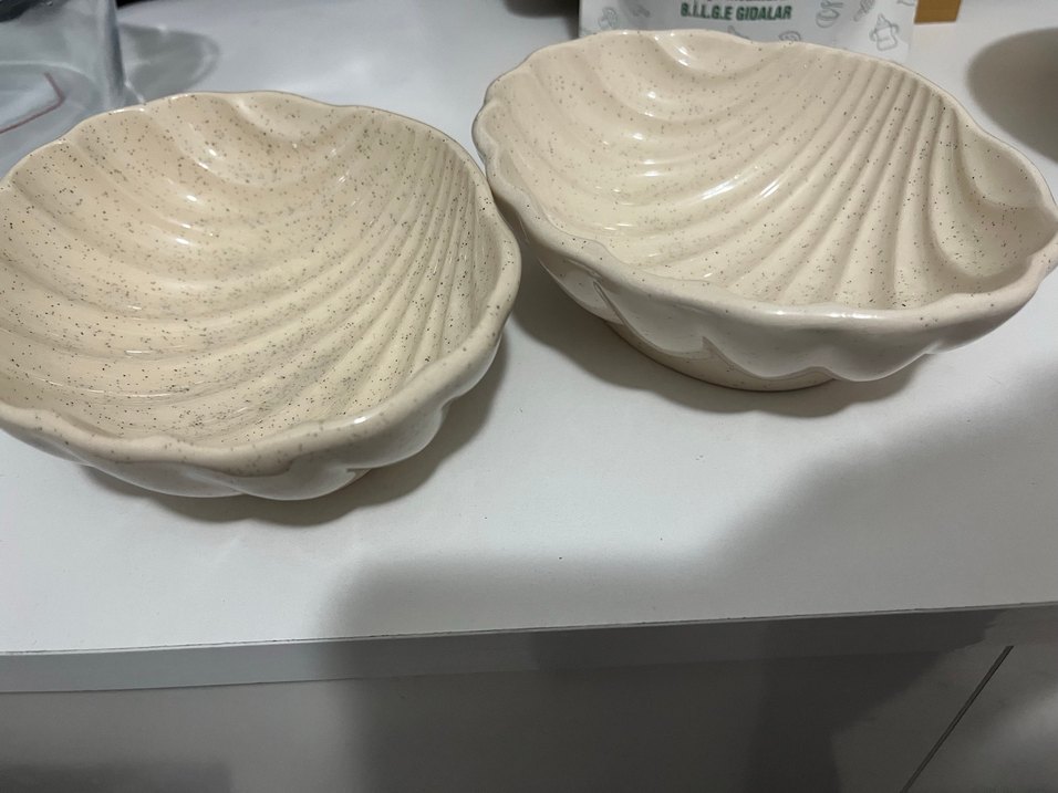İki adet beyaz, deniz kabuğu şeklinde, desensiz ve klasik tarzda kase seti.çerezlik