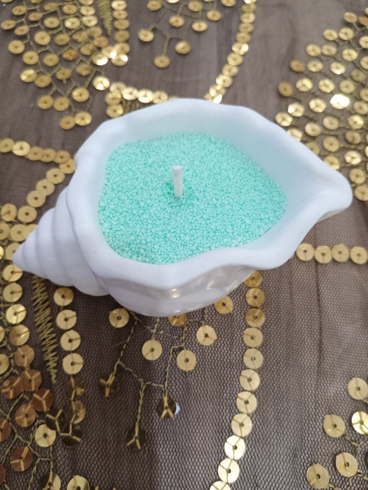 Beyaz deniz kabuğu şeklinde mumluk içinde turkuaz inci tozu mum.Vanilya kokulu.