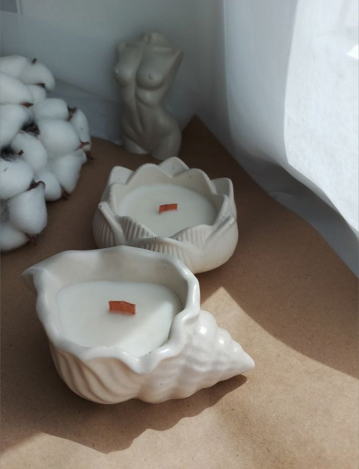 Ahşap fitilli, deniz kabuğu şeklinde beyaz mumlar, doğal ve şık bir görünüm sunar. ️