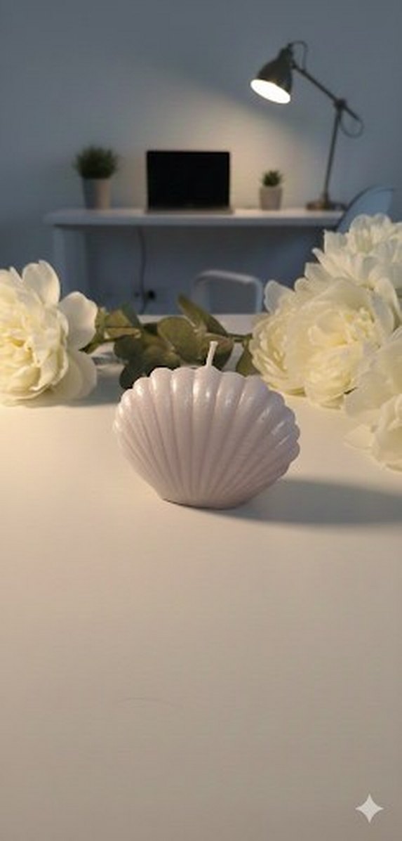 Yumuşak pastel tonlarında deniz kabuğu şeklinde beyaz mum, sakinleştirici ve dekoratif bir atmosfer sunar. ️