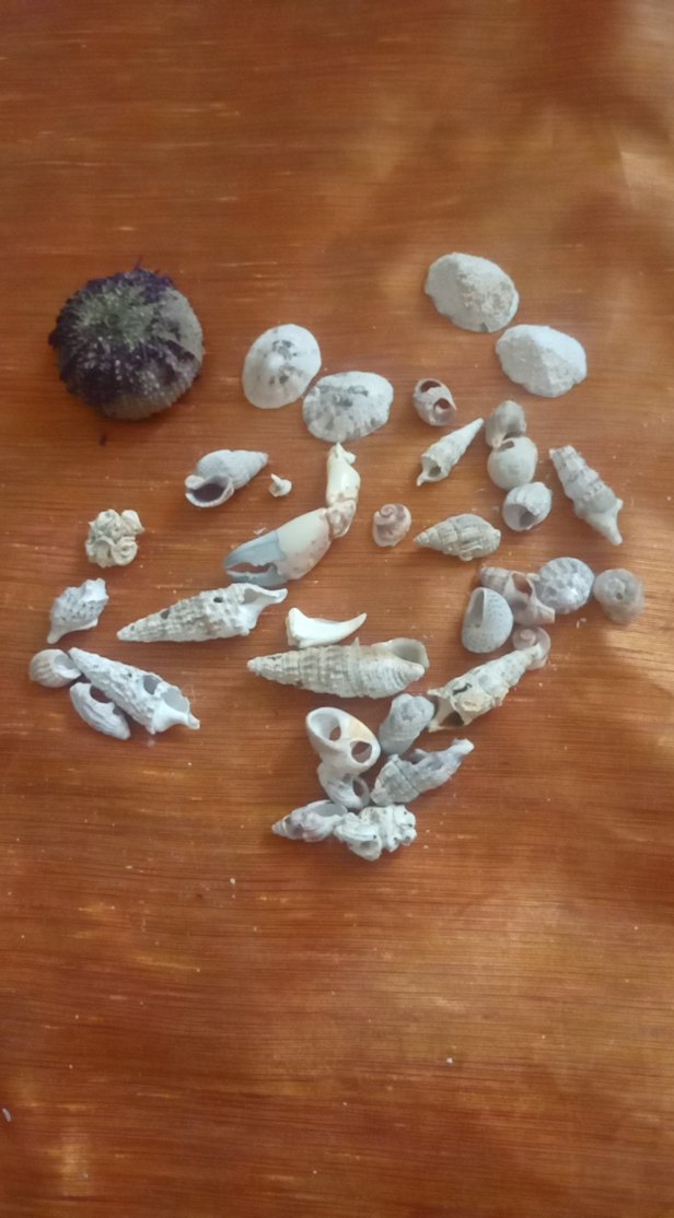 Ahşap zeminde açık renk beyaz deniz kabukları ve bir deniz kestanesi koleksiyonu.