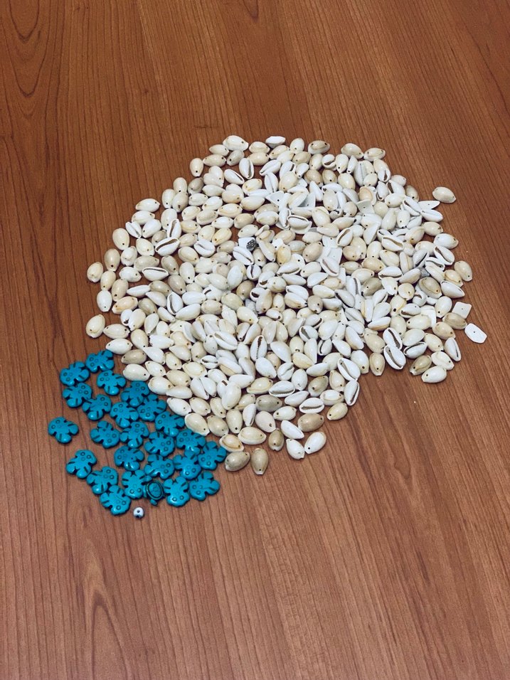 Bohem tarzı el işleri için beyaz deniz kabukları ve mavi boncuklar.