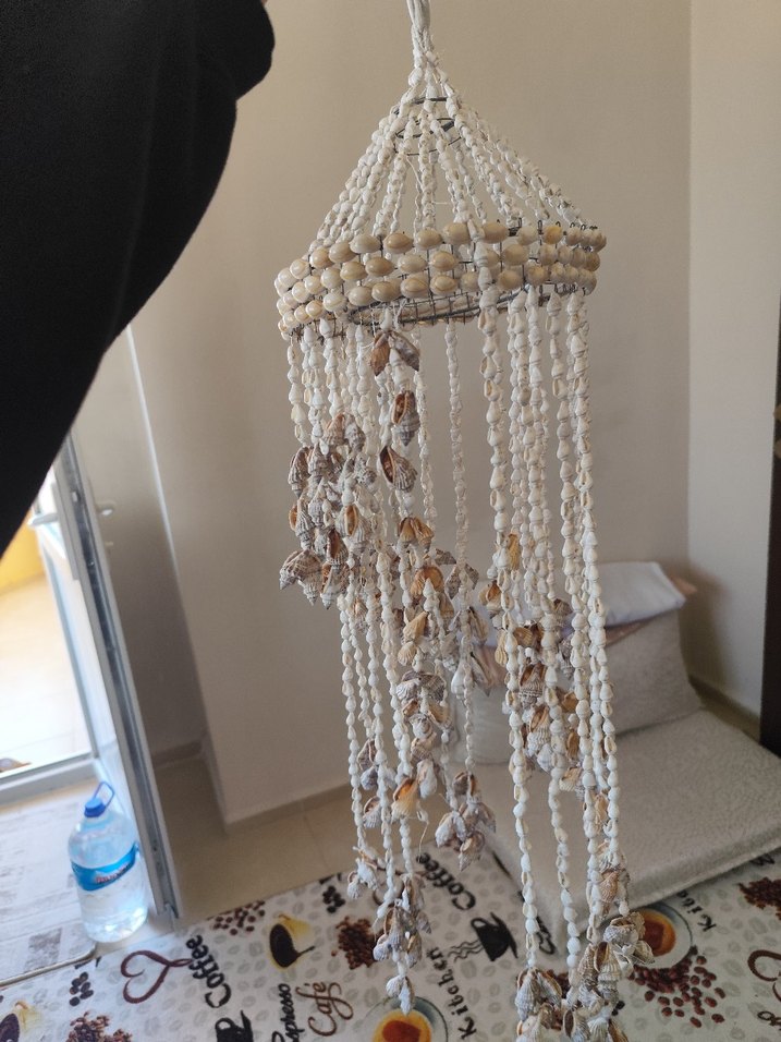 Doğal deniz kabuklarıyla süslenmiş beyaz makrome sarkaç, ev dekorasyonuna deniz esintisi katıyor.